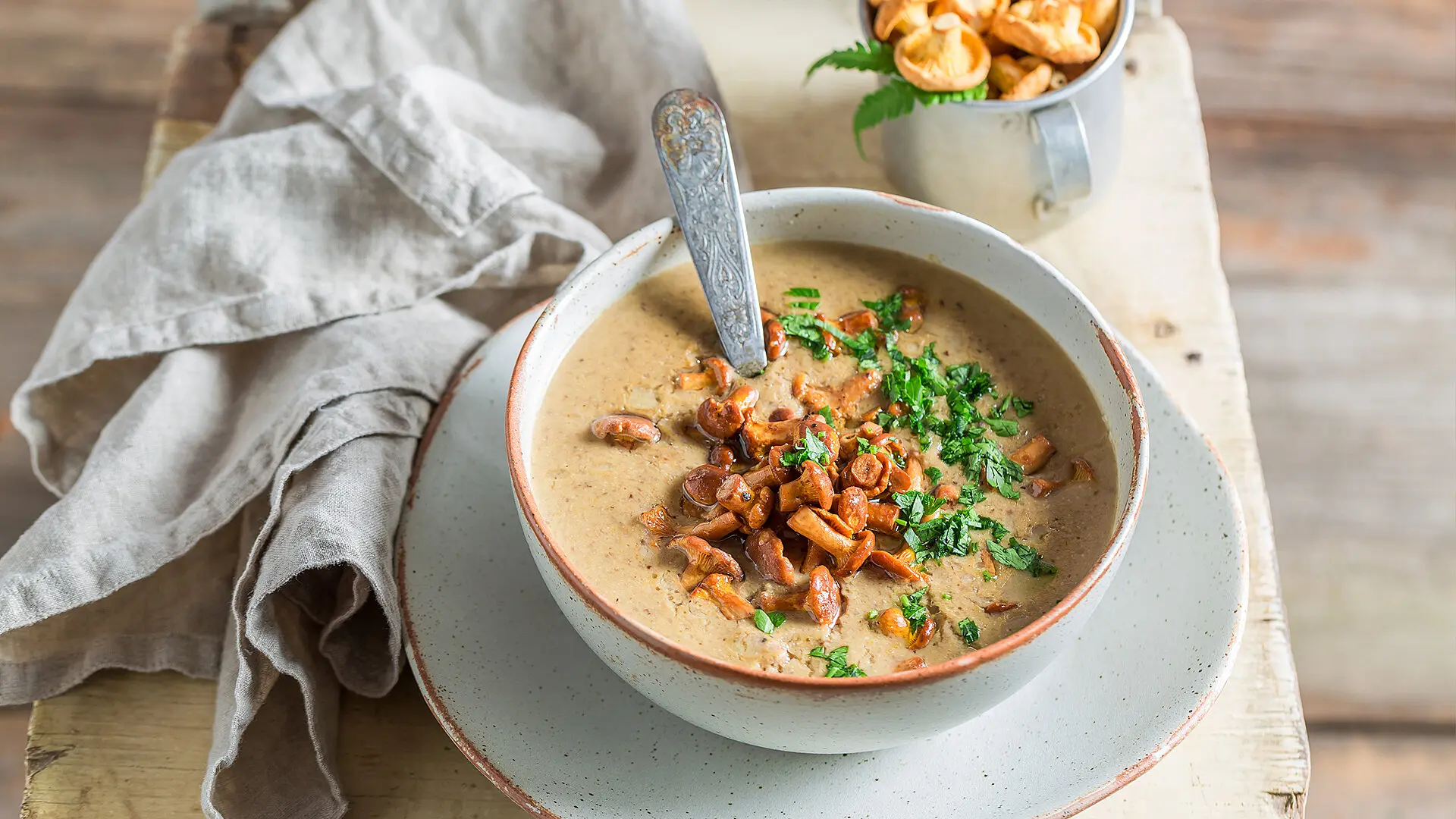 - Nach dem Andünsten die Pfifferlinge aus dem Topf nehmen und in kleine Stücke hacken. Die Hälfte davon beiseitestellen. Den Rest der gehackten Pfifferlinge in den Topf zurückgeben und kurz im Sud weiterköcheln.