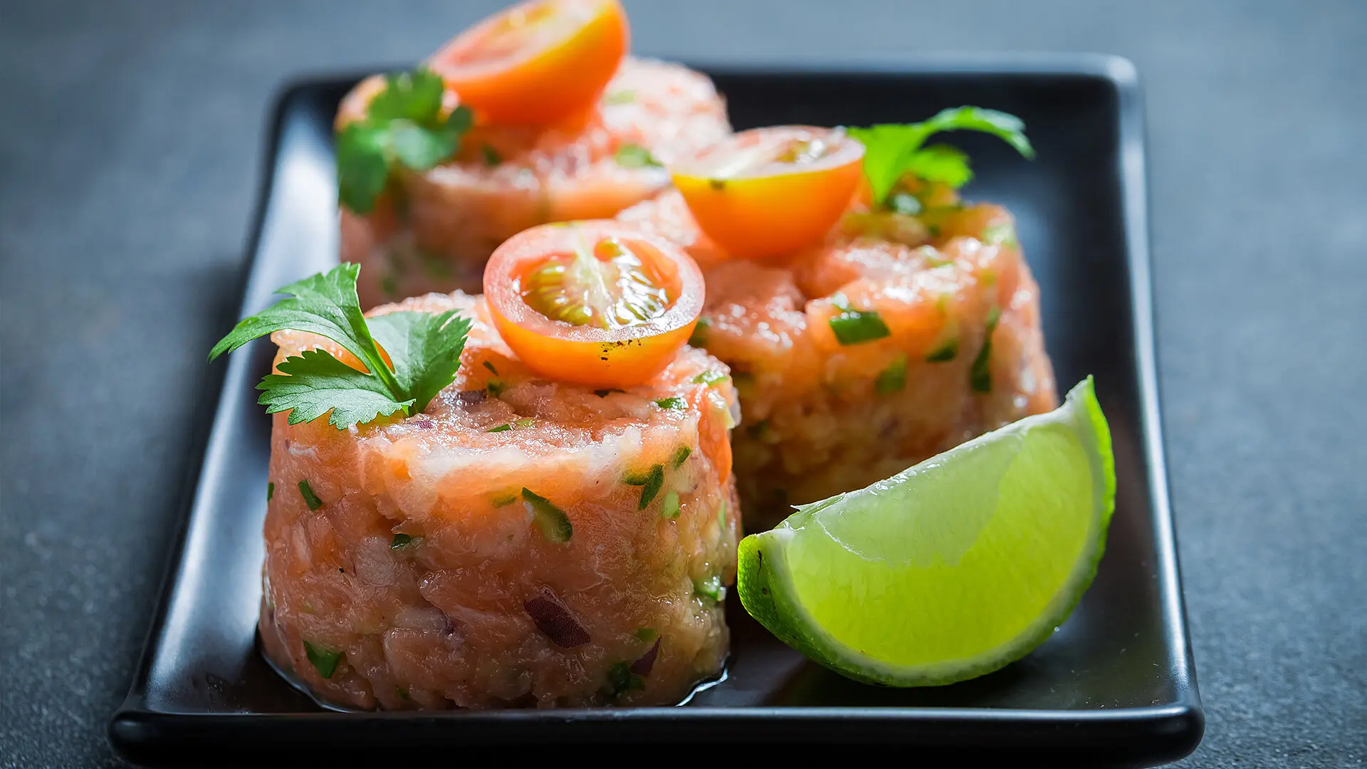 - Den Räucherlachs in feine Würfel schneiden und zusammen mit dem Zitronensaft, den gewürfelten Schalotten und dem Olivenöl vermischen. Tatar mit Salz und Pfeffer leicht abschmecken. (Vorsicht, der Lachs enthält schon eine gewisse Menge Salz).