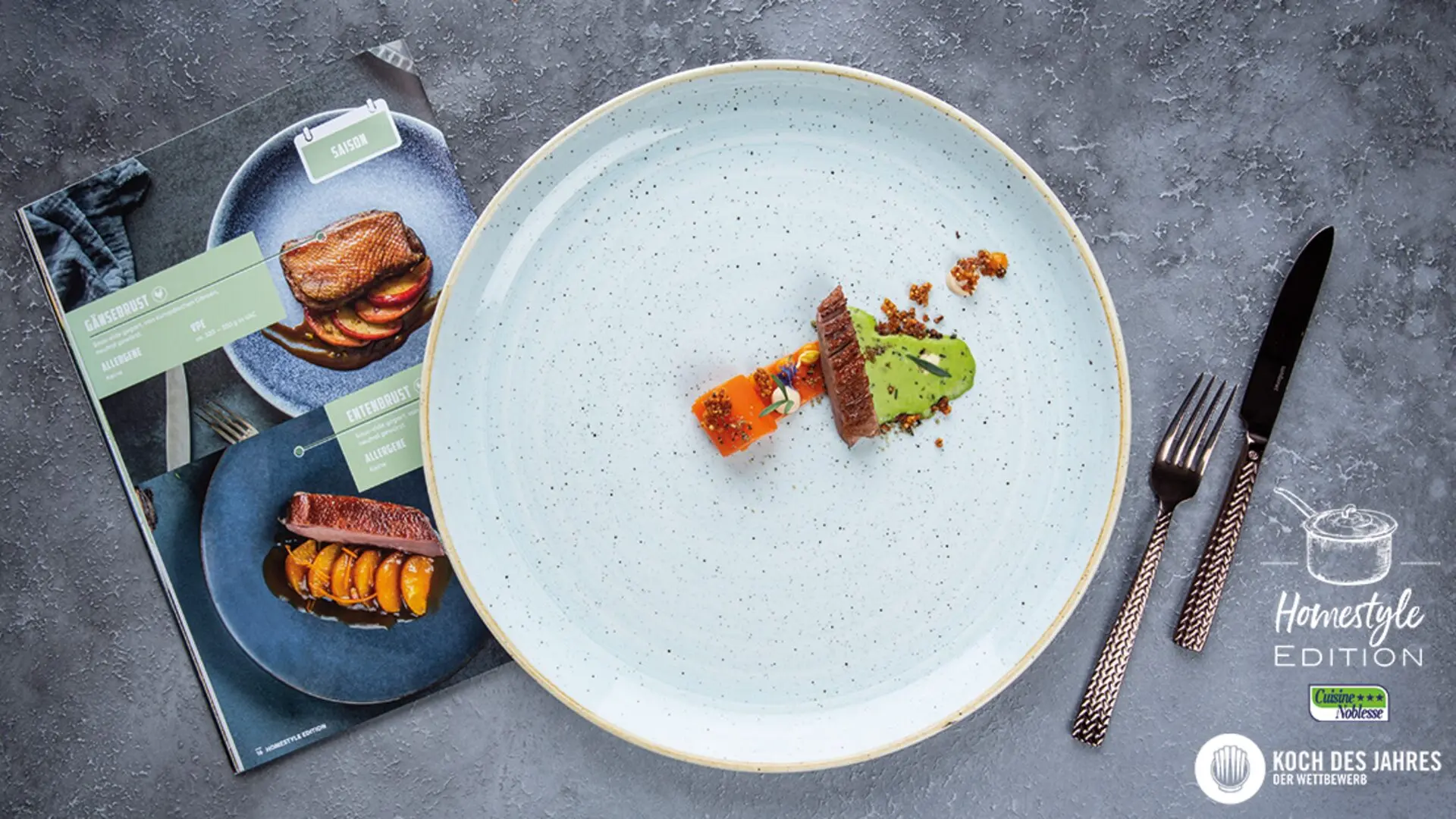 Homestyle Edition Entenbrust mit Soja-Frischkäse-Creme, Kokos-Sud, Mango-Joghurtgel und Meeresfenchel Parfait