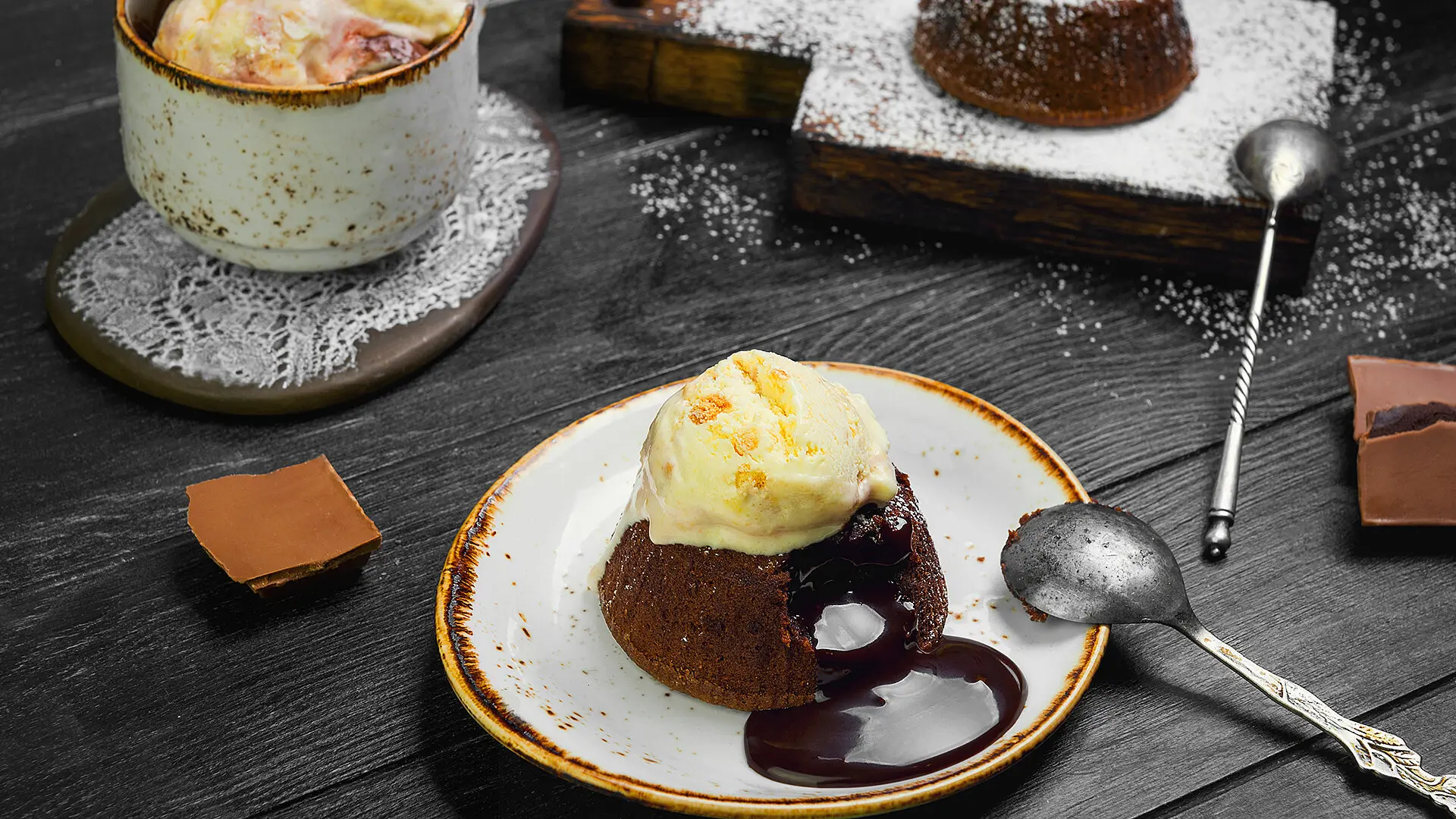 - Schokoladenfondant und Sauerrahmeis auf einem Teller anrichten und nach Belieben garnieren.
