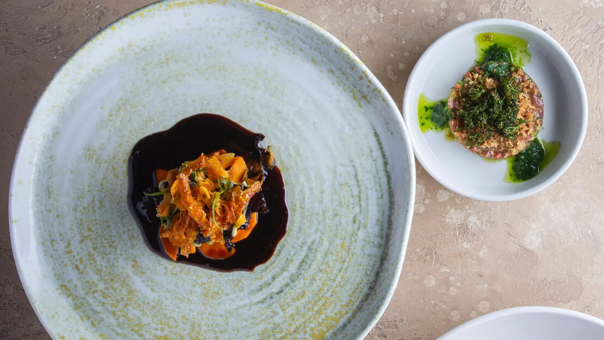 Die Hälfte der Karotten mit einem Sparschäler schälen und ausfrittieren. Die andere Hälfte mit Zitronensaft und Salz abschmecken, à la minute zusammenfügen, geschnittenen Frühlingslauch dazu geben.Tatar Agatas: